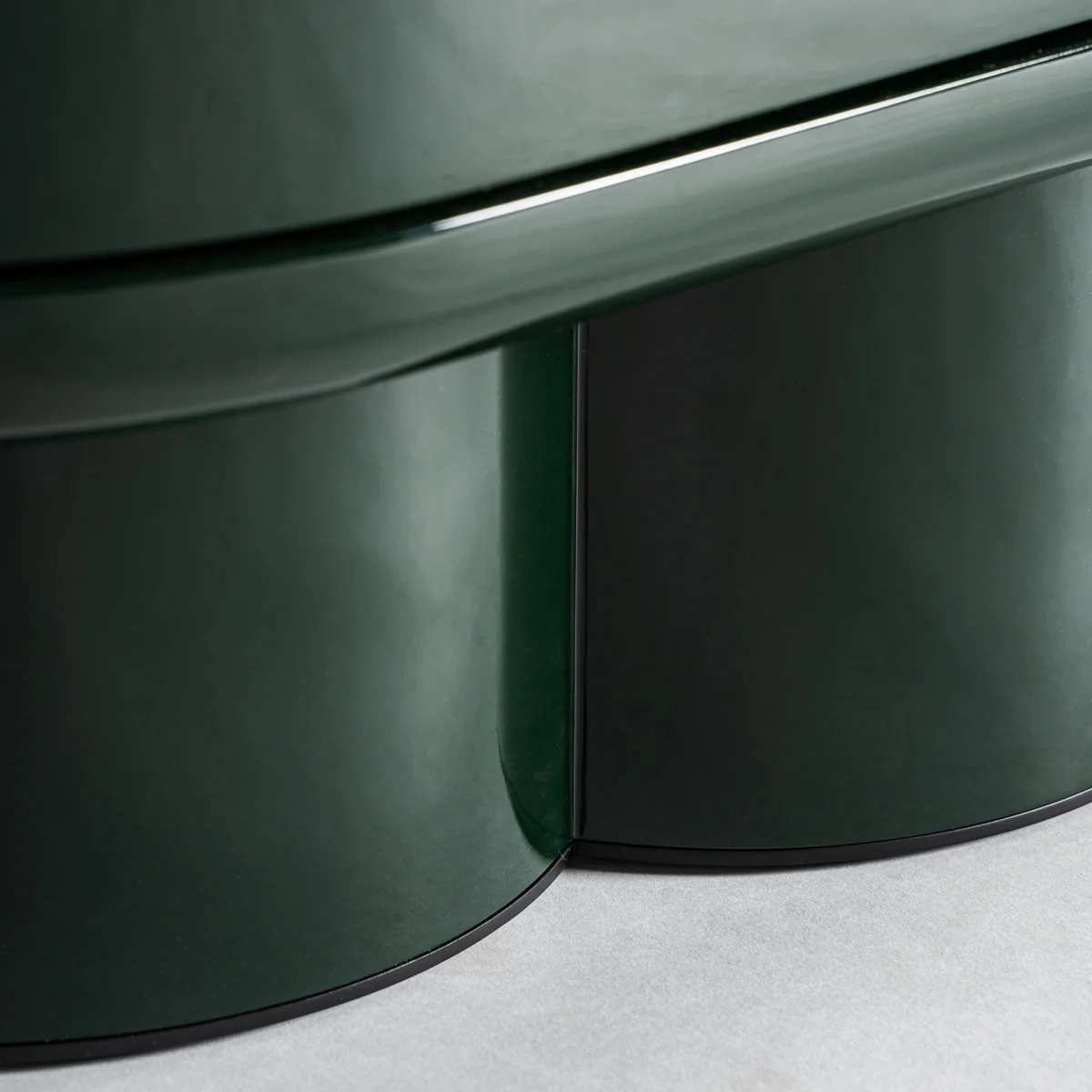 El aparador Gory de estilo Art déco es una pieza única fabricada en madera DM de color verde de alta calidad con acabado brillo, para aportar un toque vibrante a la estancia. El diseño se complementa con detalles en hierro y acero inoxidable de color dorado, creando una combinación armónica y lujosa.