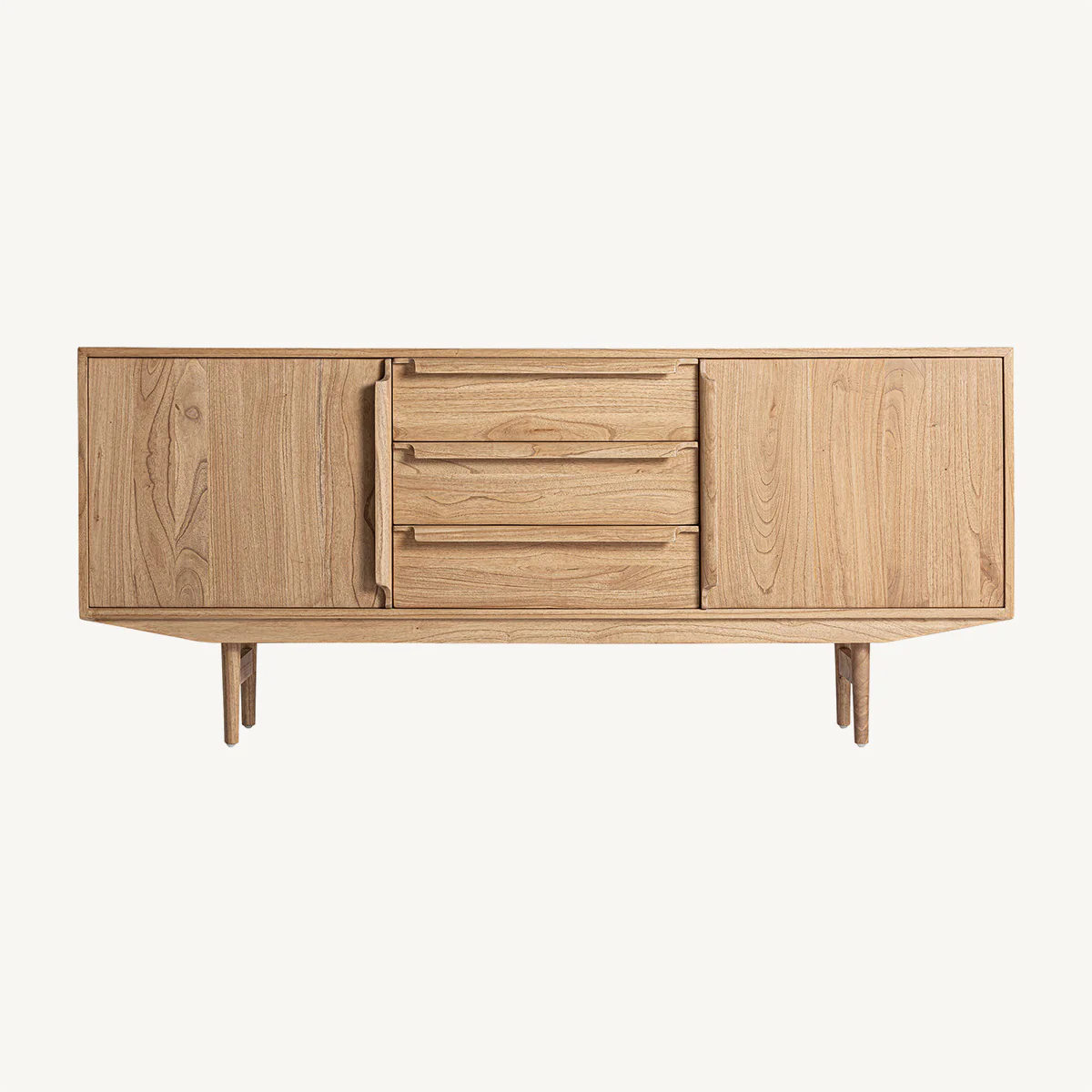 Aparador Nyry en color marrón. Fabricado con madera mindi de color natural, combina funcionalidad y estética. Su acabado en madera natural recuerda al estilo nórdico con influencia Mid Century, resaltando la belleza de la pieza y añadiendo un toque de calidez y sofisticación a cualquier ambiente.