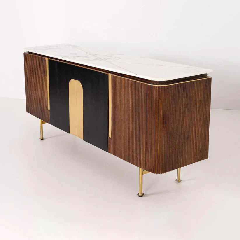 Aparador Saori en color marrón, negro y dorado. Fabricado de madera de mango, metal y tapa de mármol blanco.