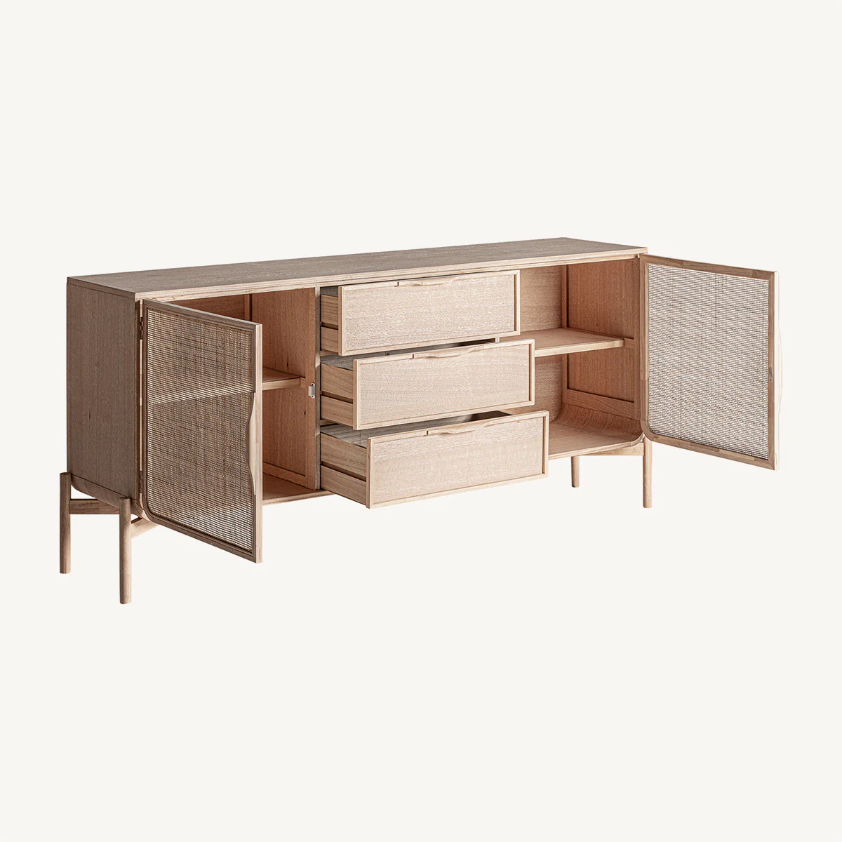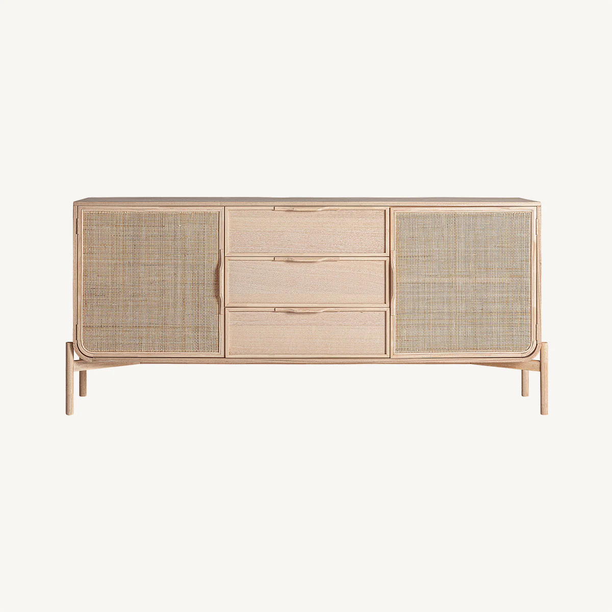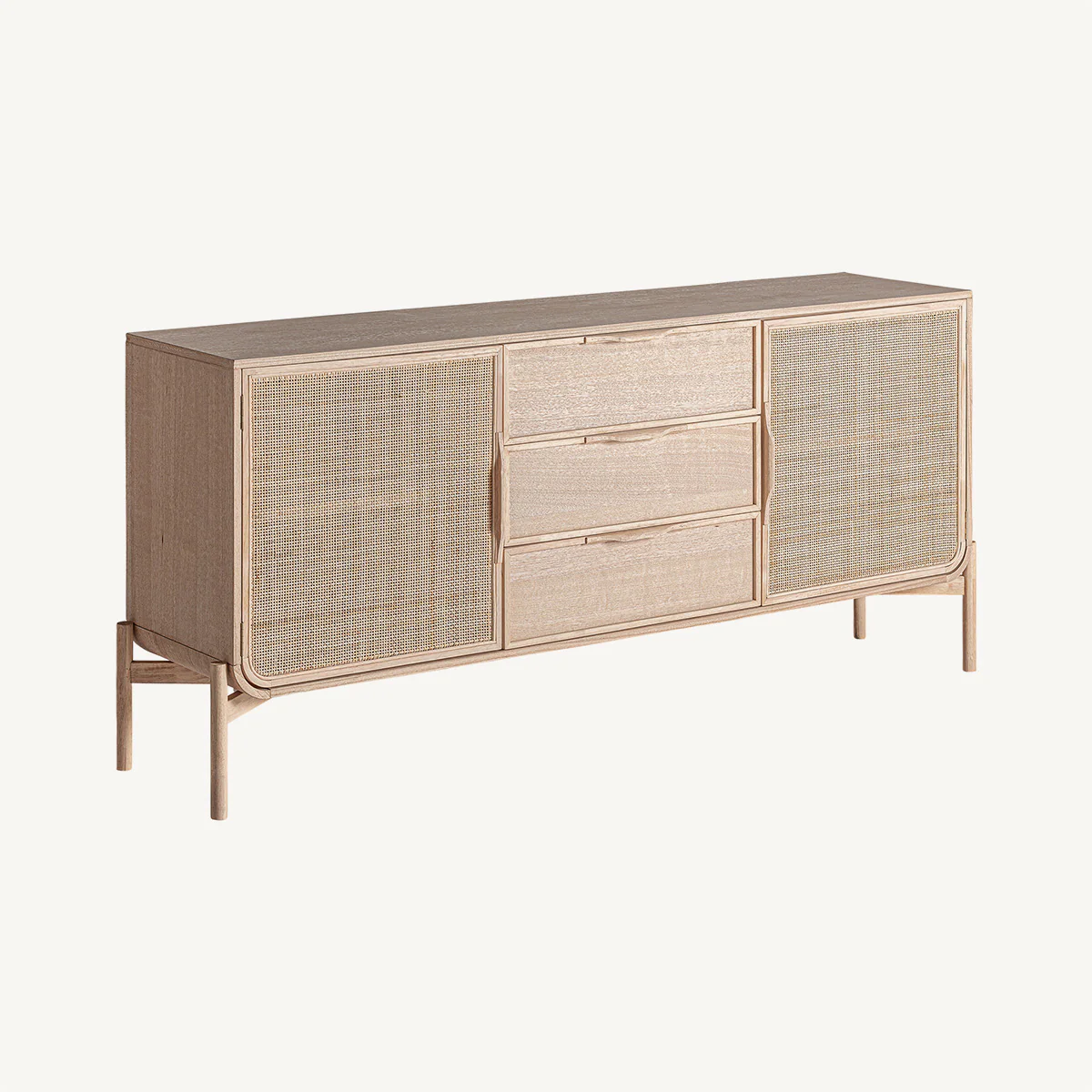 Aparador rectangular Weurtz en color marrón claro, de estilo nórdico. Fabricado en madera de fresno, combinado con ratán.