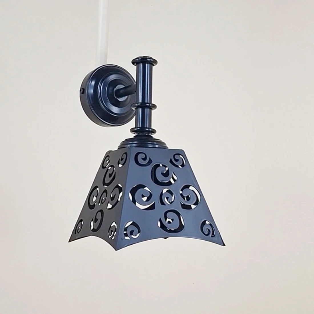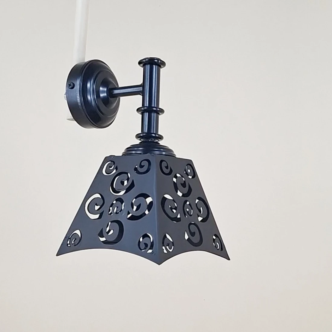 Este aplique presenta una tulipa de hierro cuadrada con un patrón calado de formas curvas, que proyecta sombras decorativas sobre la pared. Este efecto crea una atmósfera acogedora y diferenciadora, ideal para salones, pasillos o dormitorios con estilo vintage o industrial.