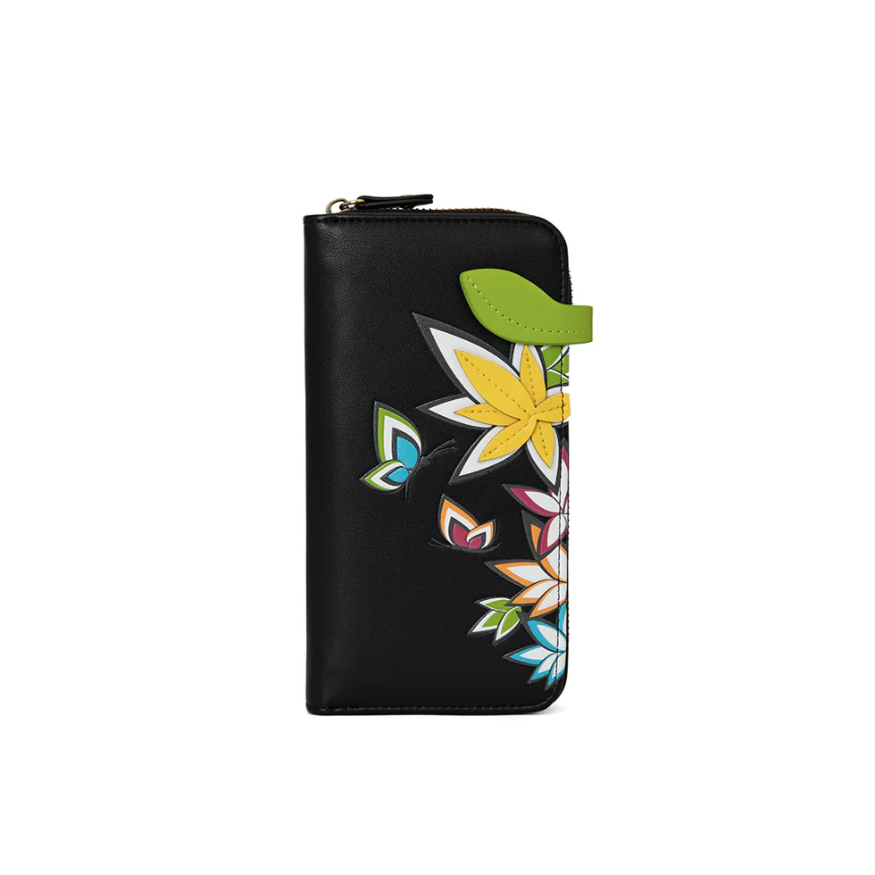 Esta billetera estilo bolso de mano tiene un cierre frontal a presión con 11 ranuras para tarjetas integradas, 1 ranura para ventana y 3 ranuras para billetes.