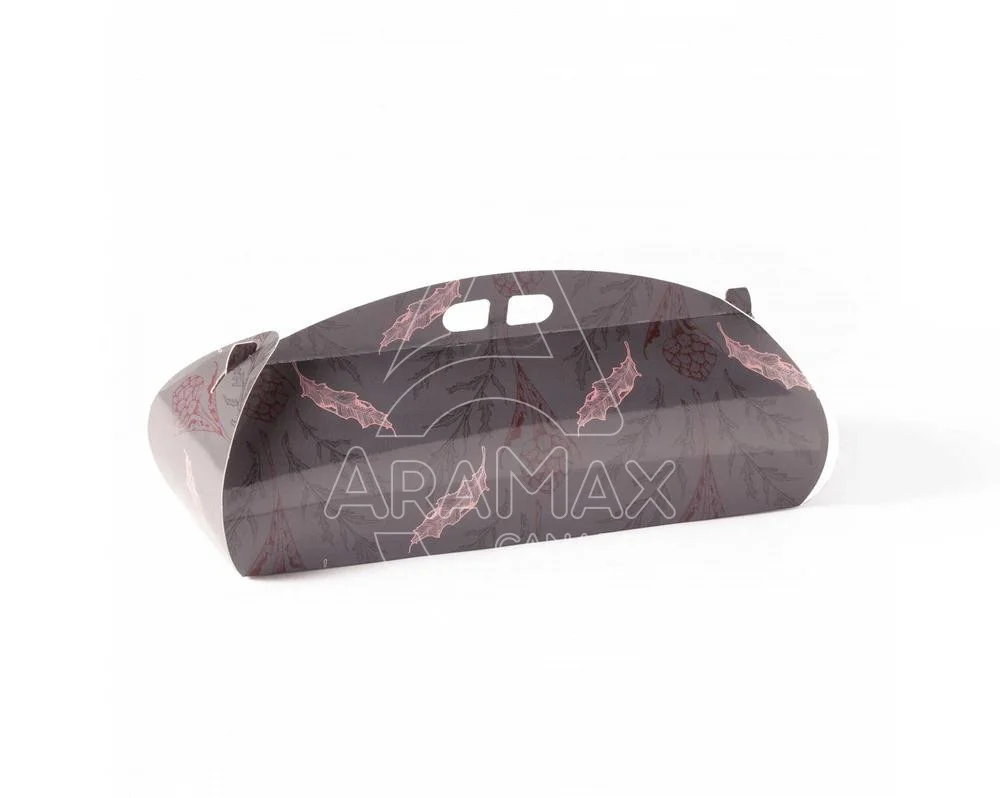 Caja de cartón para brazo de gitano. Uso eficaz para take away. Con cierre en cada lateral y un asa agarradero central con dos agujeros para el ajuste idoneo de los dedos de la mano en el transporte. Es una caja que acepta congelación, por lo que es para postres fríos. Material folding kraft muy resistente, de cartón denso.