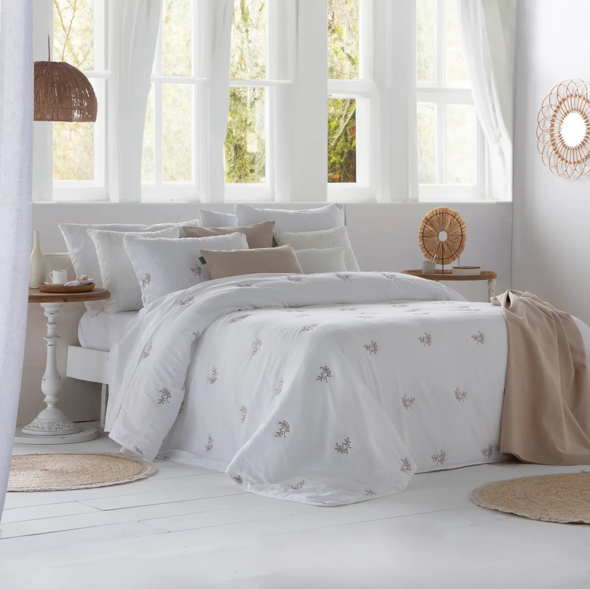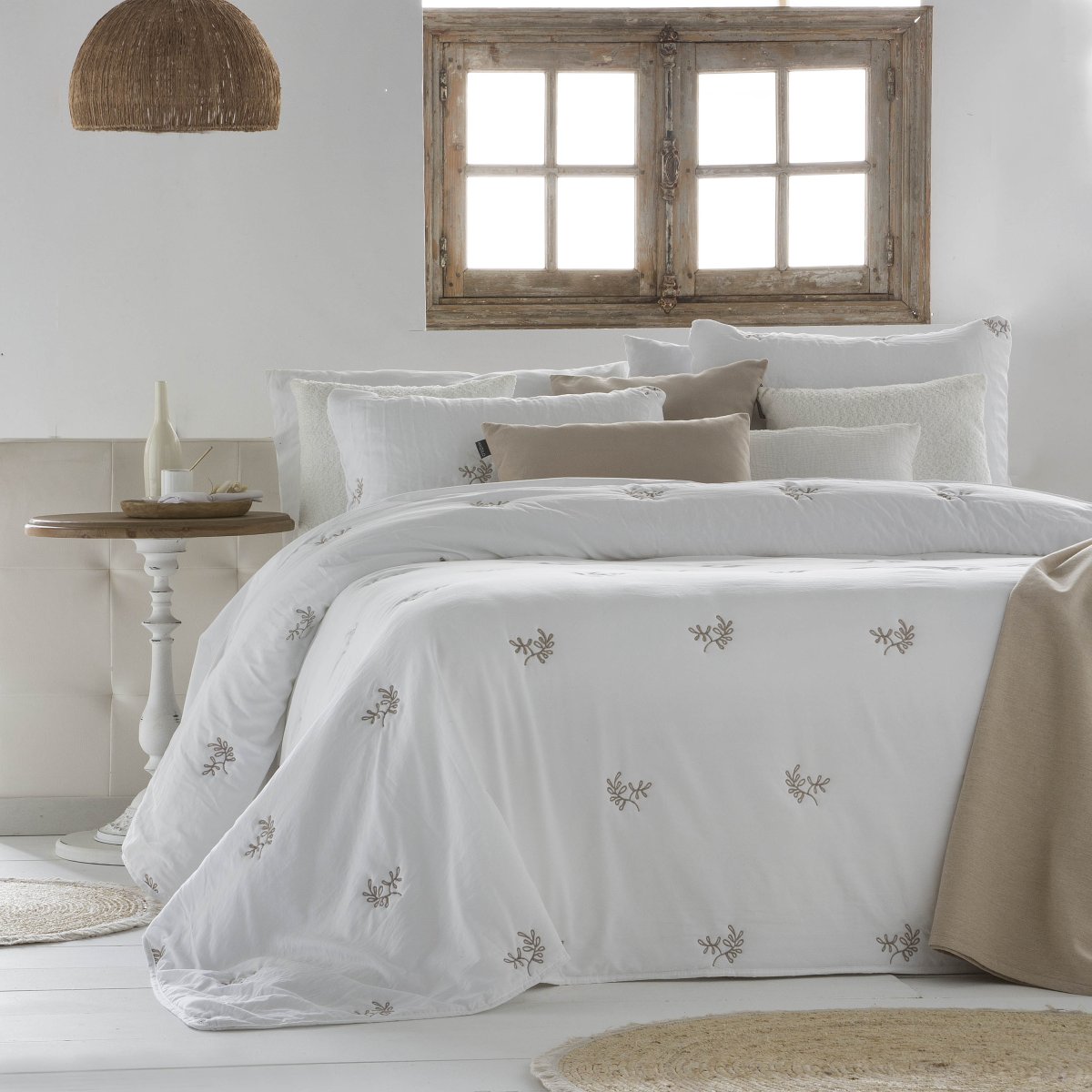 Disponible en colores blanco, lino y rosé, destaca por su diseño bordado en liso, que aporta un estilo sereno y atemporal a cualquier dormitorio. Las puntas redondeadas permiten que la colcha caiga suavemente hasta el suelo, evitando arrastres y mejorando la estética del conjunto.