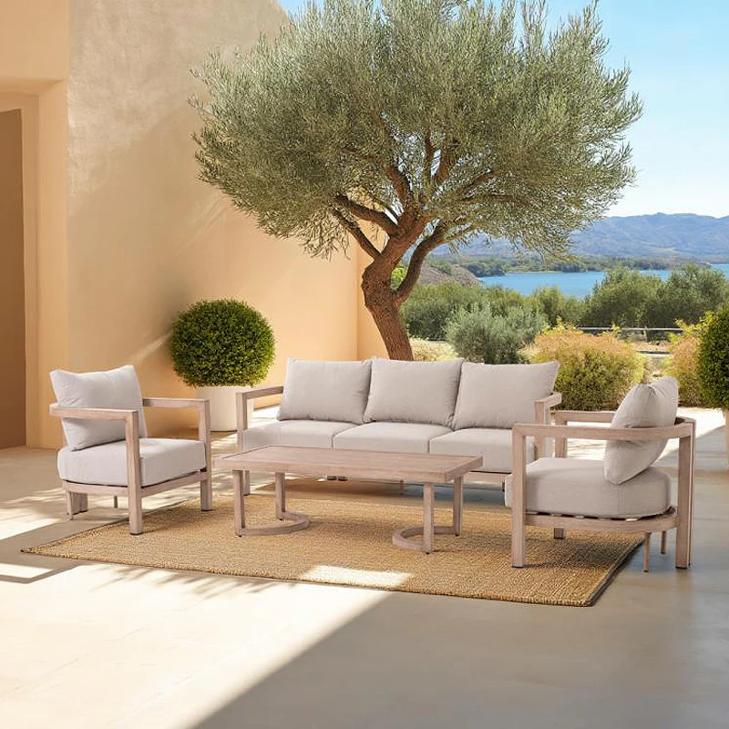 Set de exterior Aoi, compuesto por un sofá de 3 plazas, dos butacas y una mesa de centro, todo diseñado con aluminio de efecto madera y tejido beige resistente para exteriores, Perfecto para un ambiente relajante y disfrutar de momentos al aire libre.