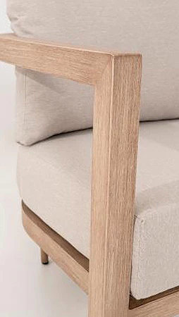 Gracias al efecto madera el sofá, las butacas y la mesa de centro se integrarán en tu terraza o jardín con un diseño muy actual pero sin peligro al desgaste por la resistencia al clima del aluminio. Una característica imprescindible para el uso en el exterior.