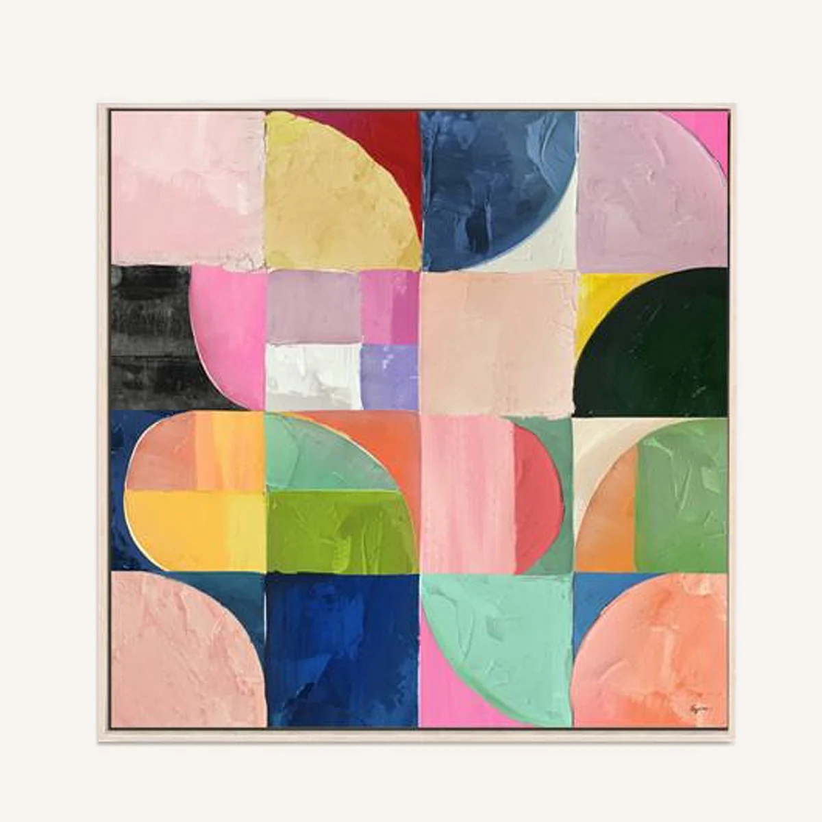 Cuadro abstracto geométrico en formato cuadrado de tamaño 120×120 cm, pintado al óleo sobre lienzo en varias tonalidades intensas de color.