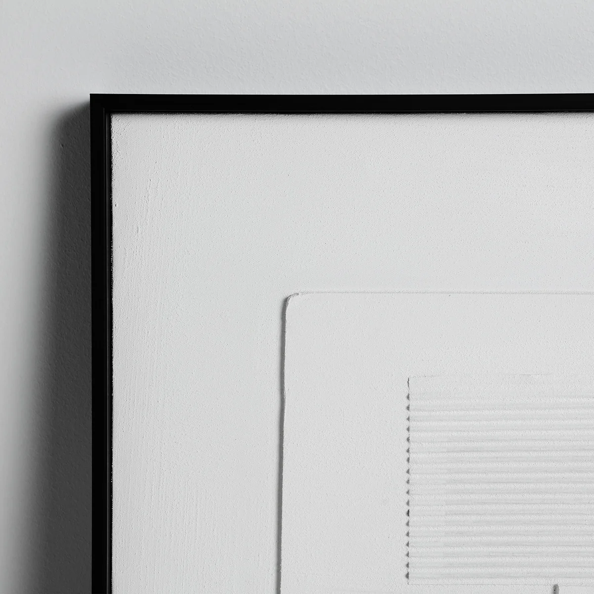 La vibrante paleta de tonos cálidos y fríos, junto con el diseño geométrico, conforma una combinación de arte abstracto con estructuras minimalistas. Fabricado en lienzo de color blanco con acabado artesanal, y combinado con poliestireno en color negro y madera de pino para el marco.