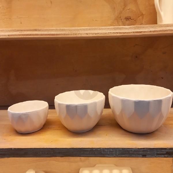 Estos bowls facetados en bizcocho destacan por su elegante diseño geométrico que añade un toque moderno a cualquier ambiente. Son ideales tanto para uso diario como para decoración, disponibles en tres tamaños para adaptarse a diversas necesidades. Su textura facetada y acabado en bizcocho permiten experimentar con distintas terminaciones en esmalte y color.