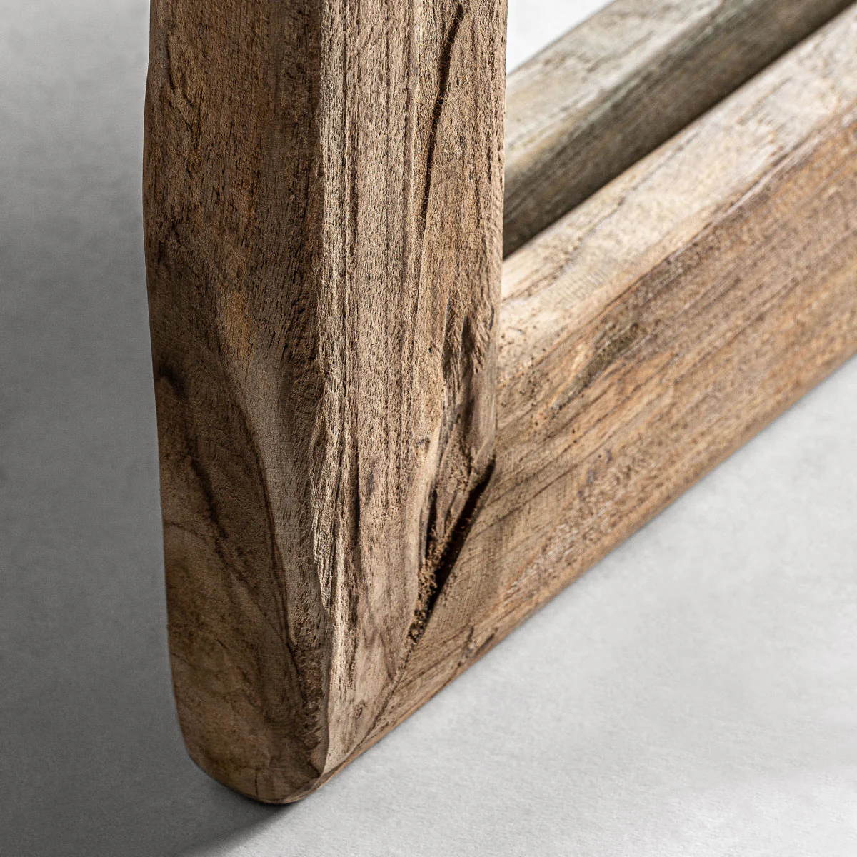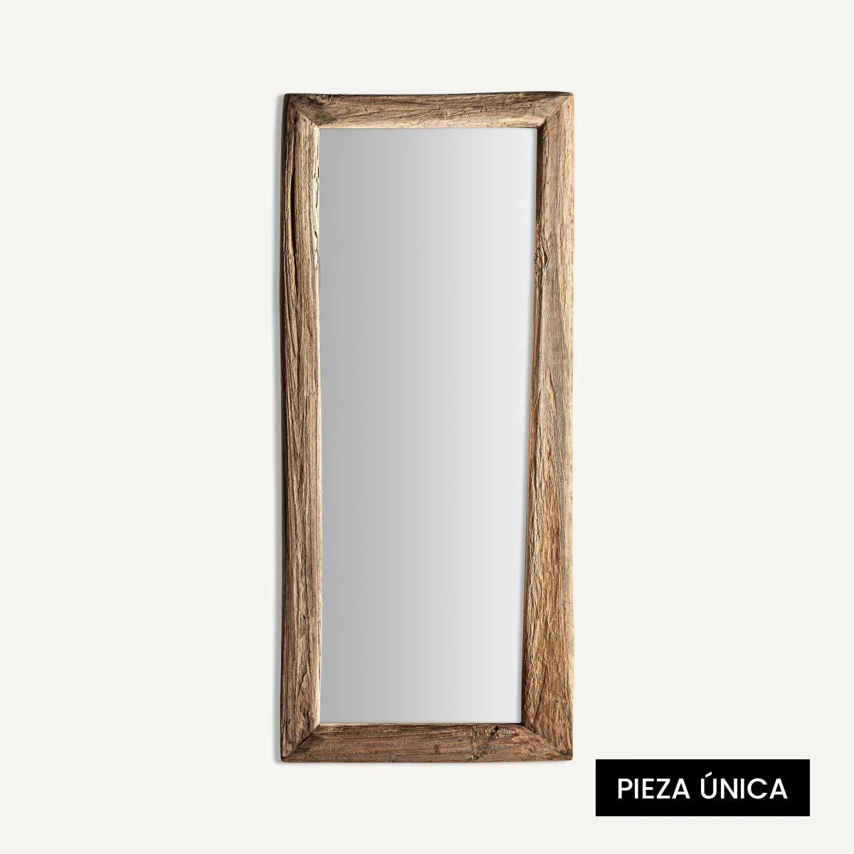 Espejo Makari de estilo étnico con acabado envejecido. Hecho a mano en madera de teca en color marrón combinado con espejo.
