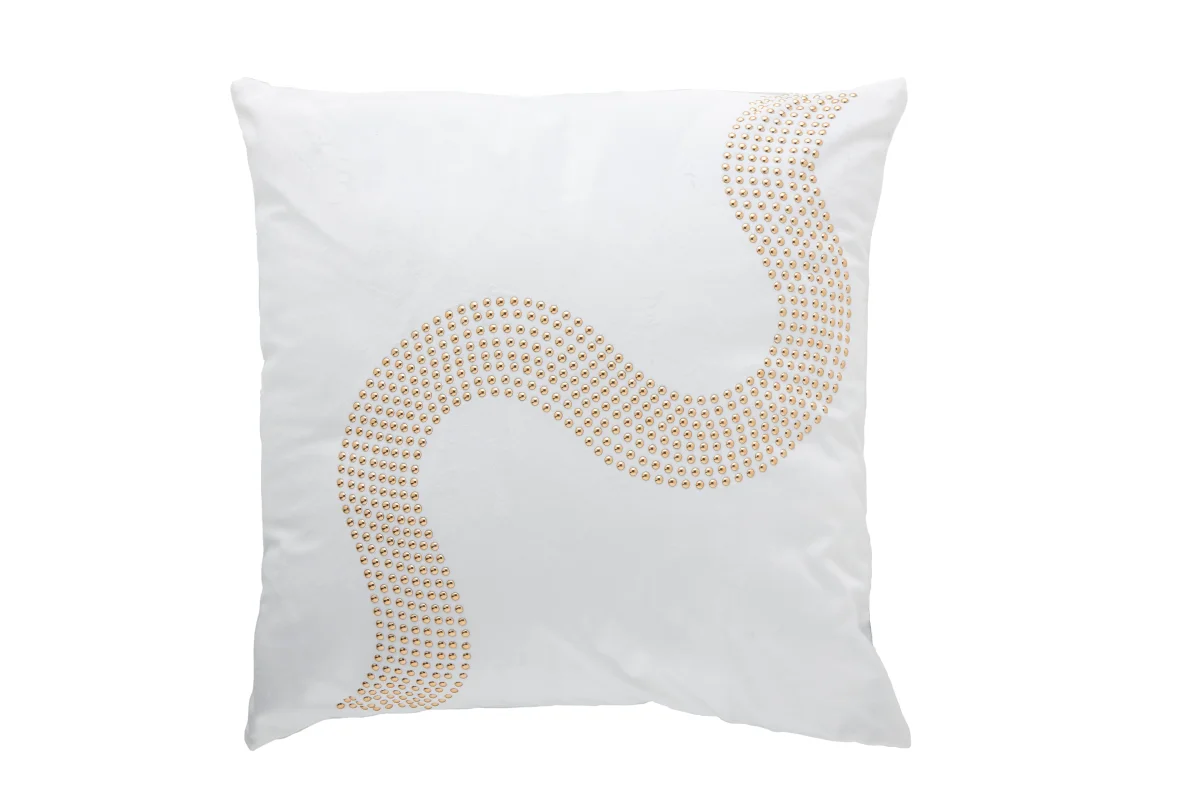 El cojín Luxury 26 destaca por su estética sofisticada y su toque moderno. Su base de terciopelo, suave y agradable al tacto, aporta calidez y elegancia, mientras que una línea sinuosa de tachuelas metálicas doradas, dispuesta en forma de “S”, recorre el frontal creando un efecto brillante y dinámico que capta la luz y añade personalidad al espacio.