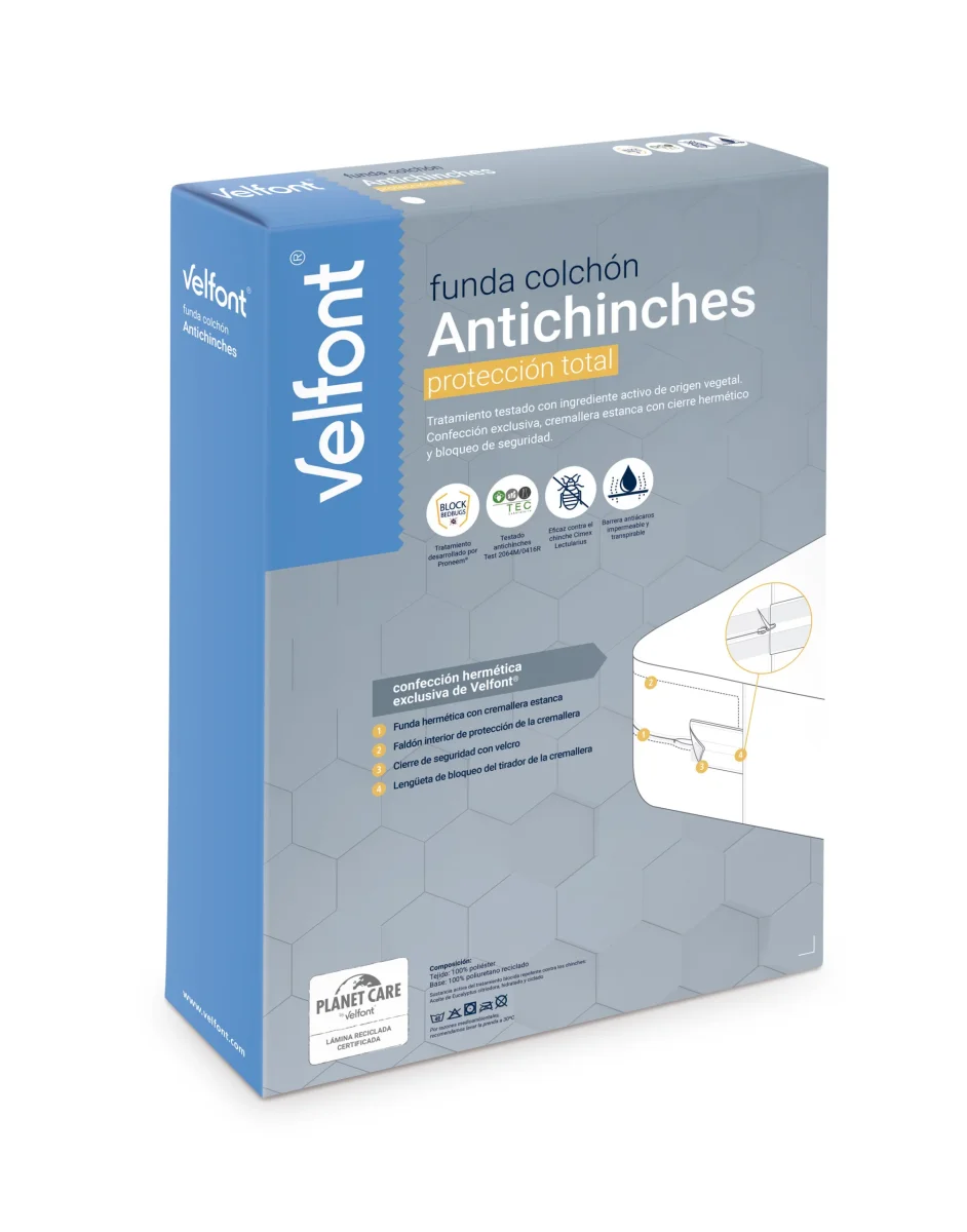 Protección total gracias a su confección hermética, exclusiva de Velfont, con cremallera estanca, faldón interior, cierre de seguridad con velcro y lengüeta de bloqueo que garantizan una protección integral de tu colchón evitando, además, que chinches o ácaros puedan alcanzar el colchón.