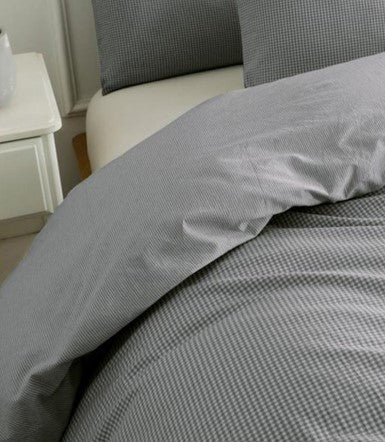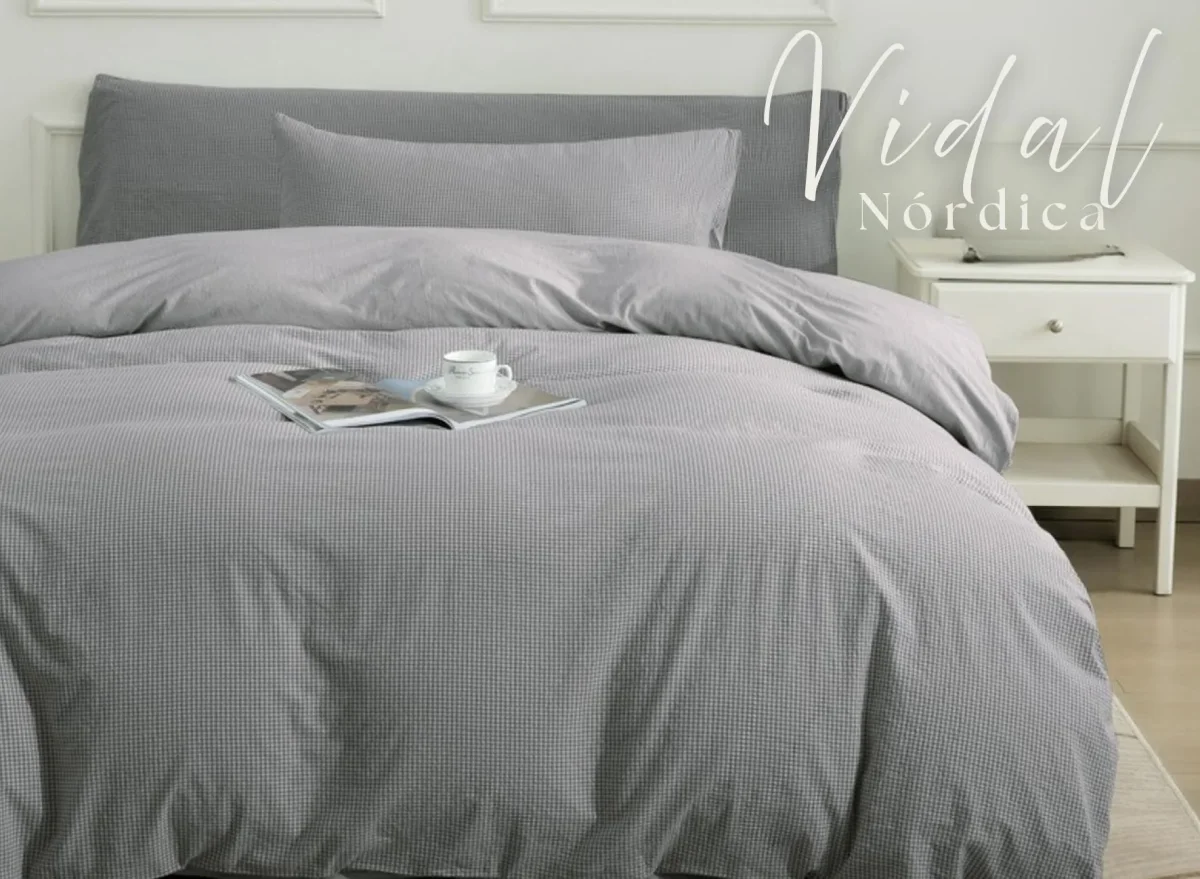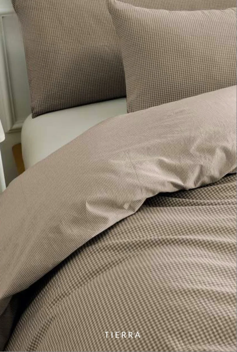 Funda nórdica de algodón 100% hilo teñido, con un diseño reversible: unas finas rayas y un sutil dibujo de cuadros que aporta textura, calidez y un estilo atemporal. Su acabado ofrece un tacto suave y natural, gracias a su composición de 180 hilos, perfecto para crear un ambiente relajado y acogedor en el dormitorio. Disponible en tres colores —tierra, verde y gris— para adaptarse a distintos estilos decorativos.