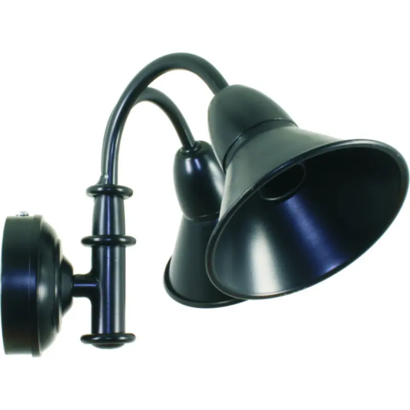 Iluminacion baño forja tulipa pequeña con dos brazos, construido en ángulo de 45 grados. La funcionalidad de este tipo de lámparas es perfecta para iluminar estancias que no necesiten de demasiada luz. Acabado color negro (00). Medidas aproximadas con pantalla: Ancho 31cm, alto 25cm, profundidad 22cm.