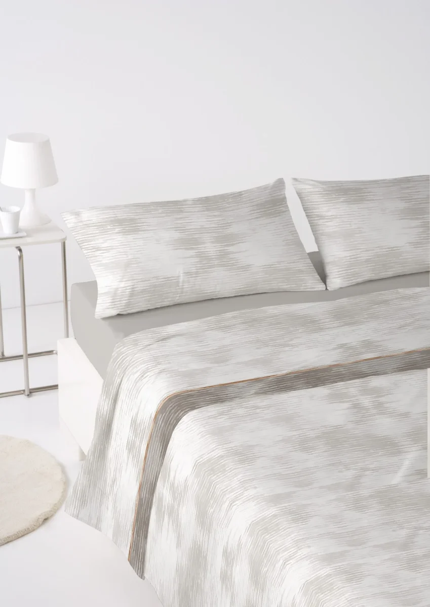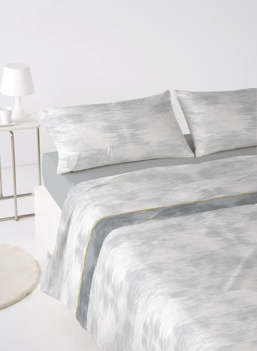 Este juego de sábanas presenta un diseño moderno y versátil, con un patrón sutil en la sábana encimera y la funda de almohada, mientras que la bajera es lisa y a tono. Confeccionado en Microseda de 240 g/m², ofrece una suavidad extra y un tacto aterciopelado que garantiza confort térmico durante la noche, convirtiéndolo en la opción perfecta para los meses más fríos.