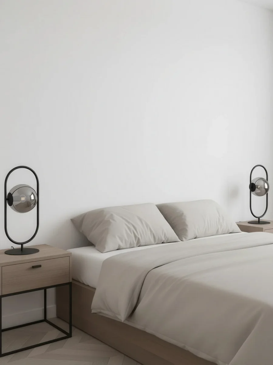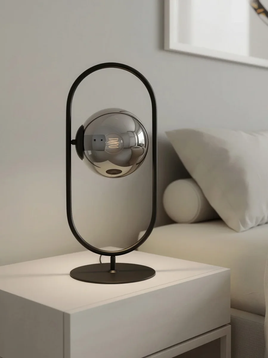 Lámpara de mesa en color negro con una esfera de vidrio ahumado negro. Fabricada de acero. Perfecta para colocar en la mesita de noche o en la mesa auxiliar del salón para proporcionar la mejor iluminación.