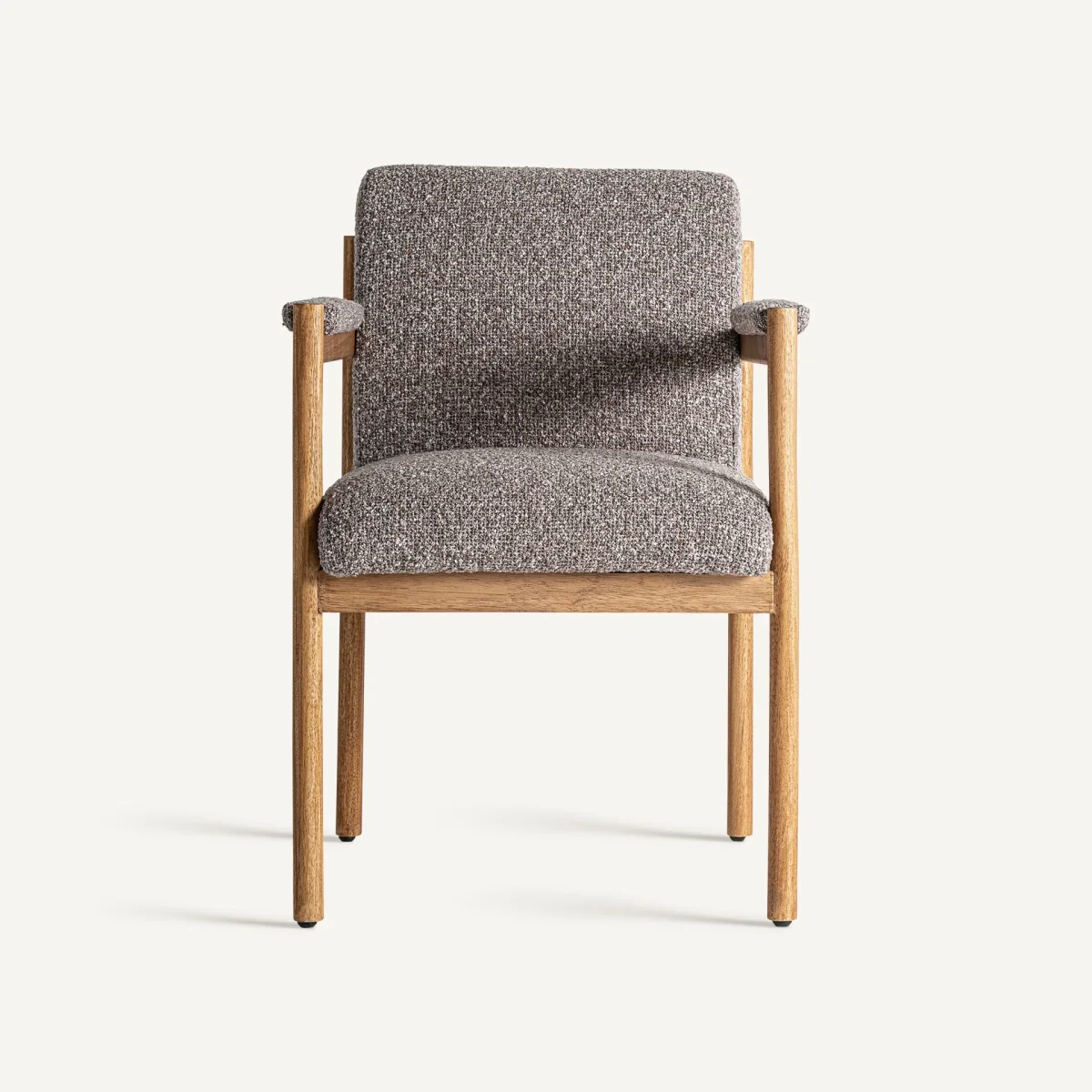 Silla Bezier de estilo colonial, fabricada en madera de caucho natural, espuma y poliéster gris.
