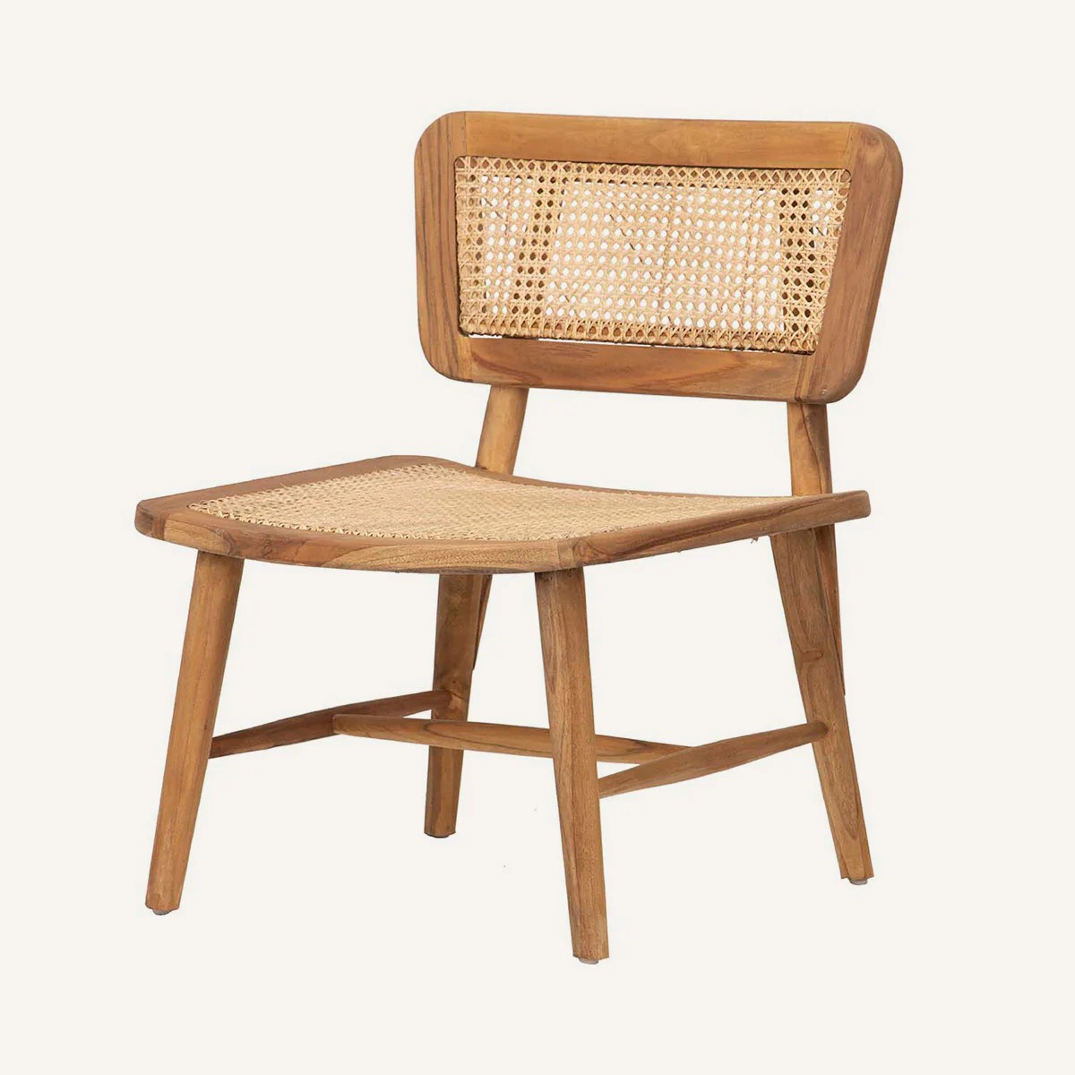 Silla Olivillo fabricada con madera de teca y ratán, en color natural.