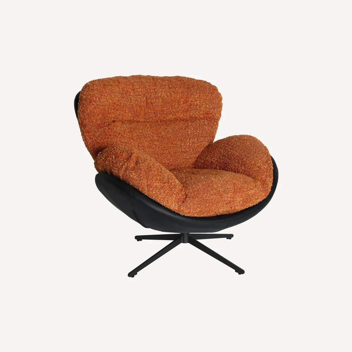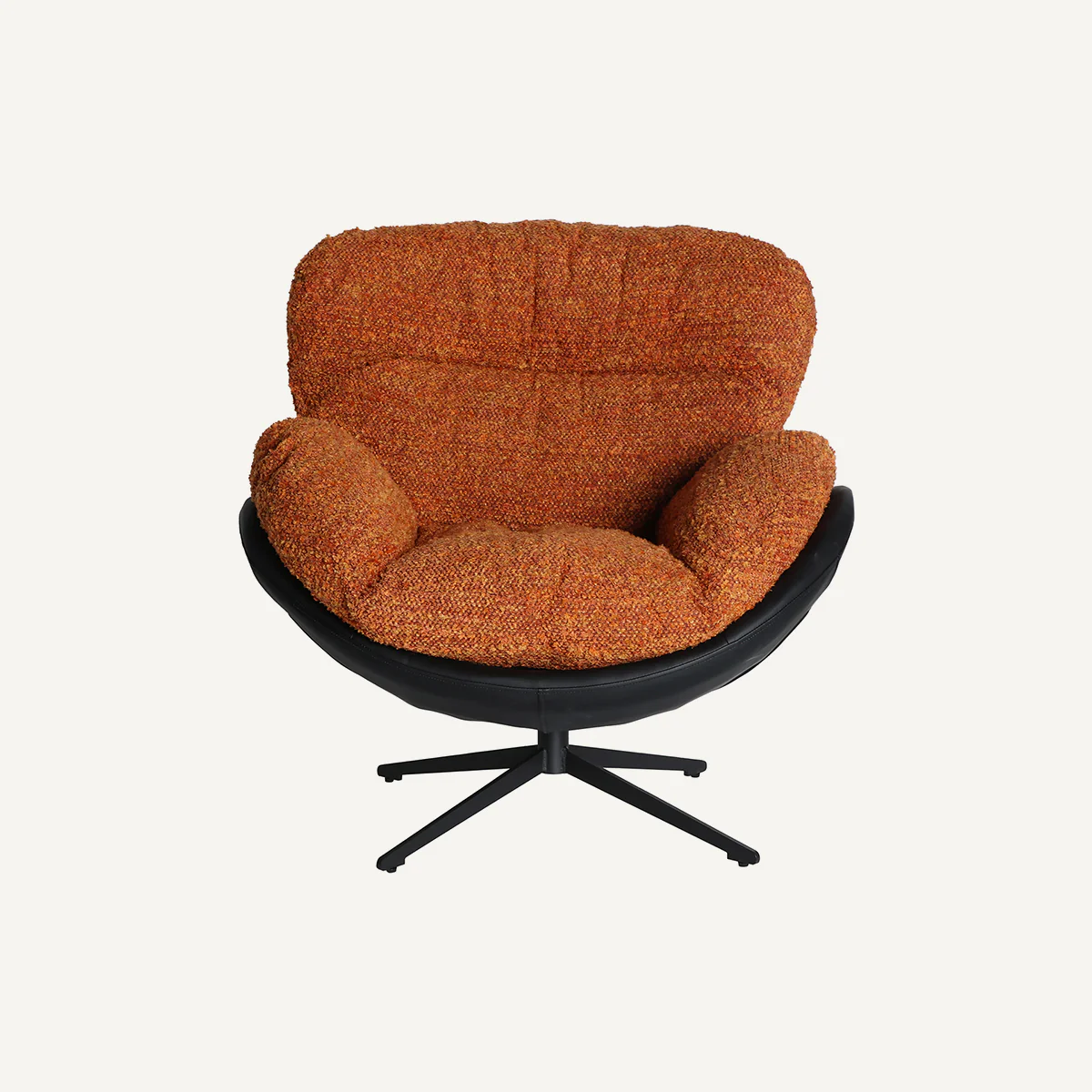 Su textura en tejido tipo bouclé y base giratoria, transmiten la calidez de un asiento acogedor que combina confort, sofisticación y estilo contemporáneo. Perfecto para colocar en el salón o cualquier rincón de calma.