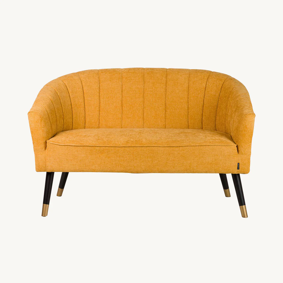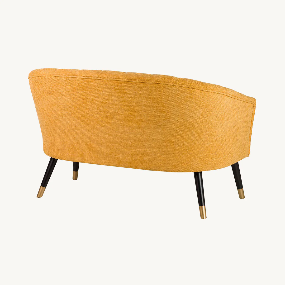 Sofá Gleditsia de dos plazas en color amarillo con patas en negro y detalles dorado. Fabricado en madera combinado con tela chenilla.