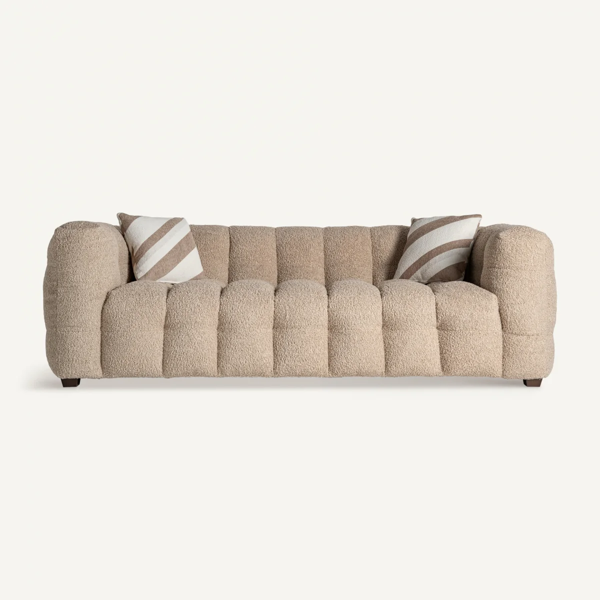 Sofá Maurs de tres plazas en color marrón beige y patas de madera de pino marrón.
