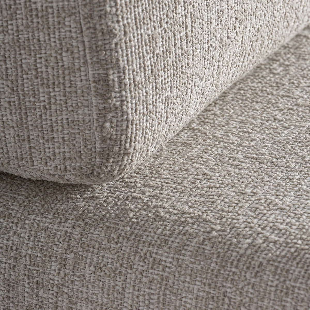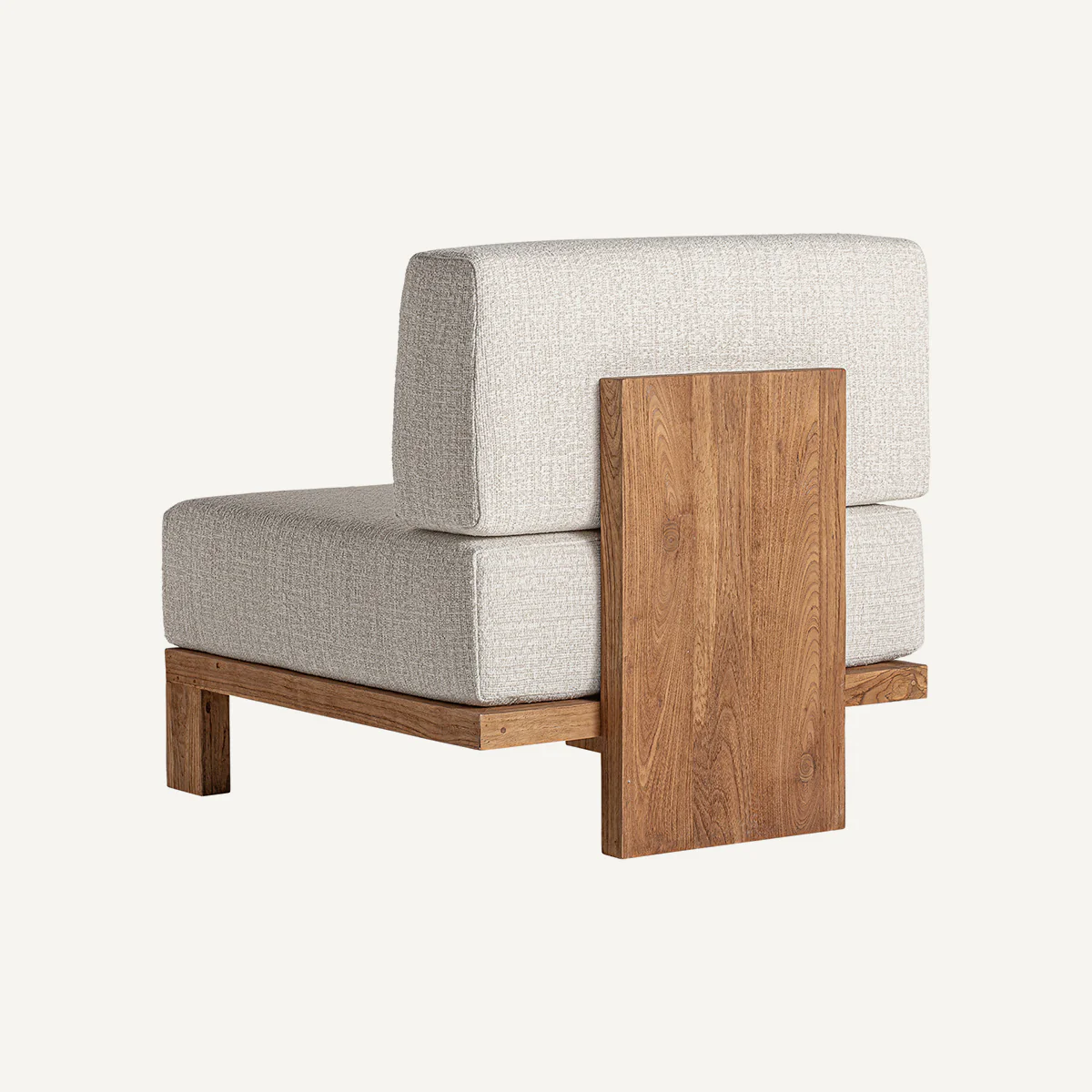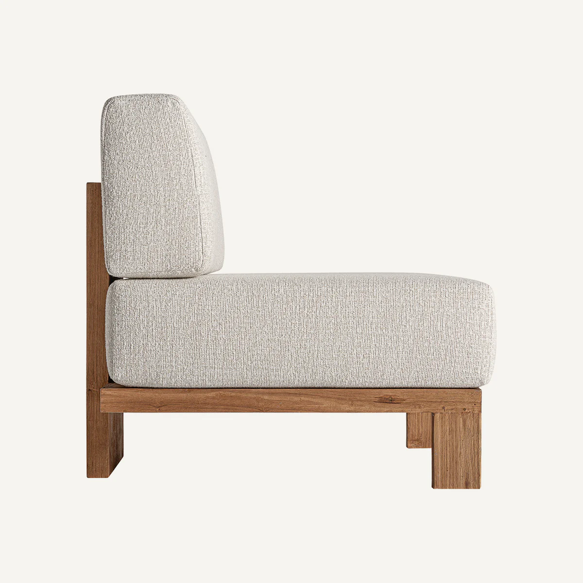 Sofá Testa, módulo central, de estilo colonial. Fabricado en madera de teca reciclada en color marrón con acabado natural, combinado con polipropileno reciclado en tonos de color marrón/beige con acabado de tejido poliéster jaspeado y espuma.