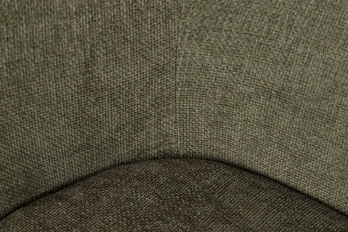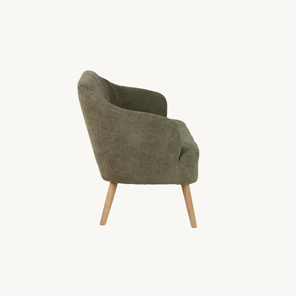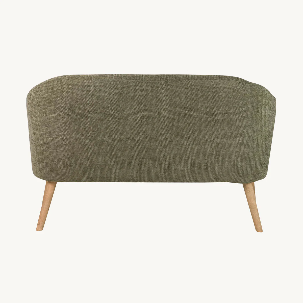 Sofá Prunus en color verde con patas en marrón natural. Fabricado en madera combinado con tela chenilla.