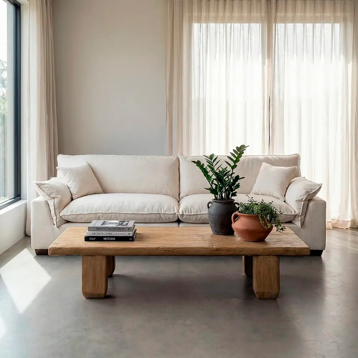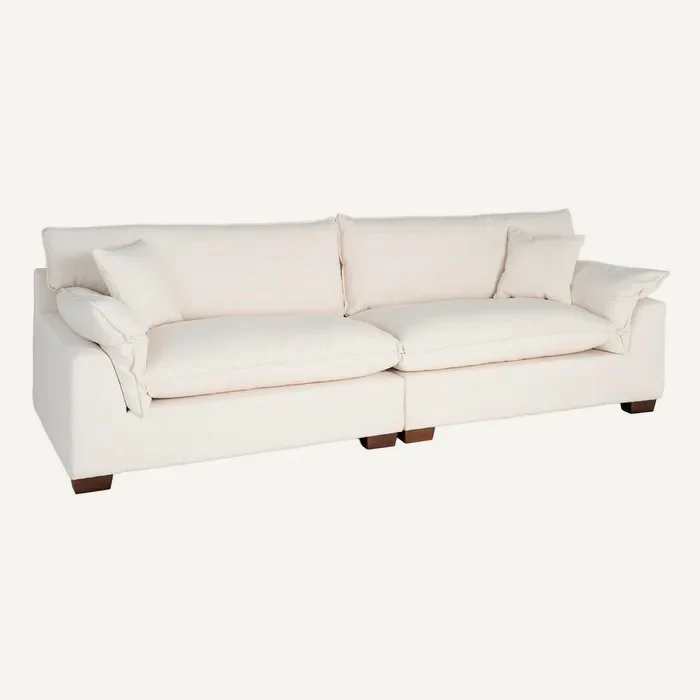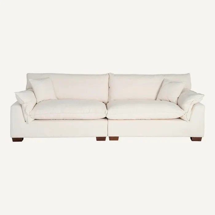 Sofá Rangi de cuatro plazas en color crema, compuesto de una estructura robusta, asientos del respaldo y laterales rellenos de doble pluma, todo íntegro fabricado con un tapizado poliéster en tejido de lino. Patas de madera maciza.