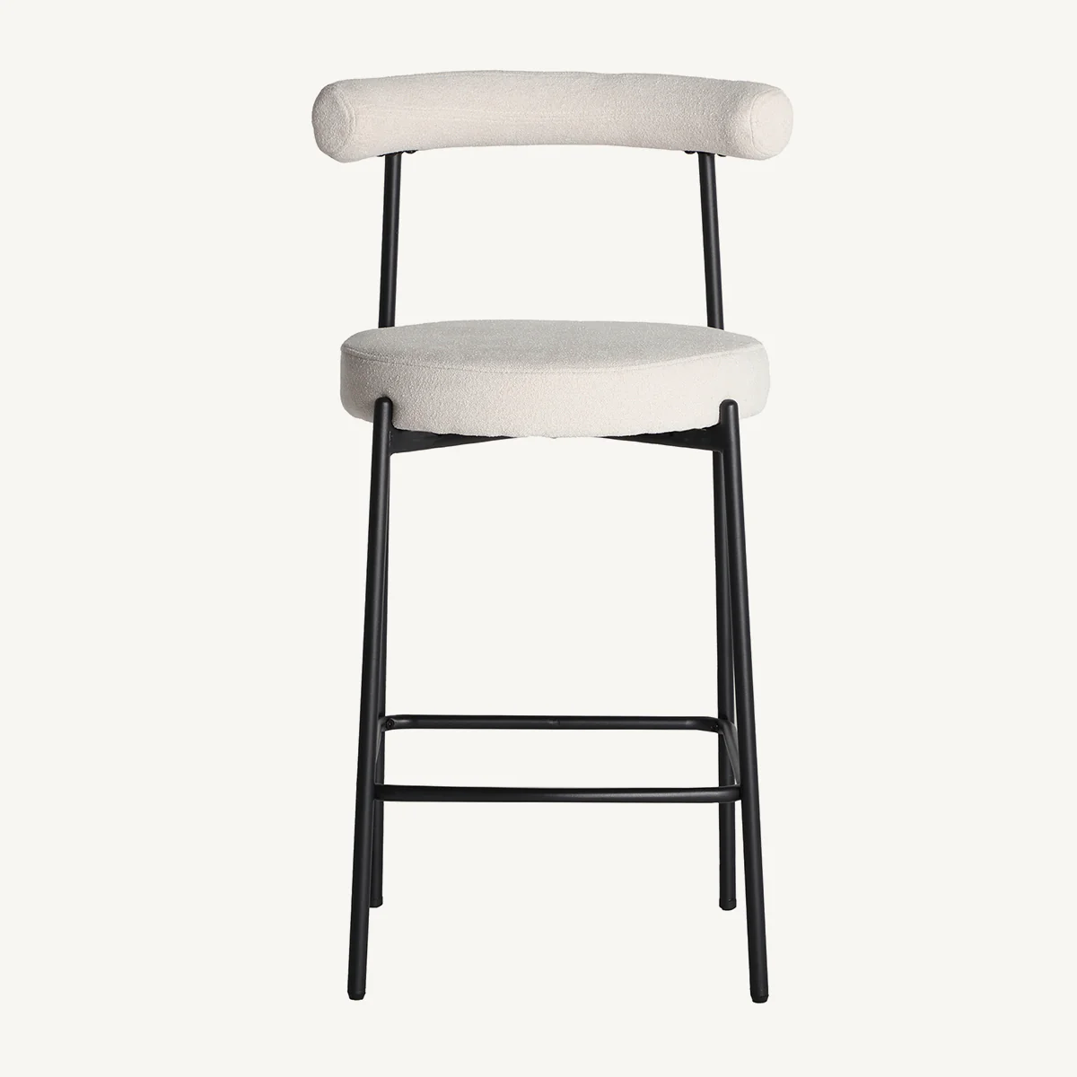 Taburete Breville tapizado en color blanco roto con estructura de hierro negro. Fabricada en poliéster de alta calidad, asegura durabilidad, confort y un acabado suave al tacto. La estructura de hierro negro ofrece soporte estable con una estructura ligera.