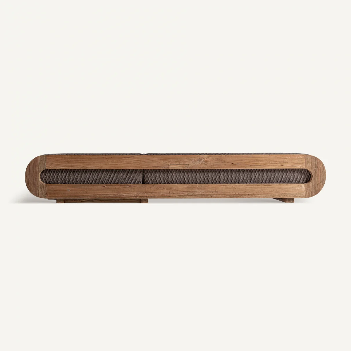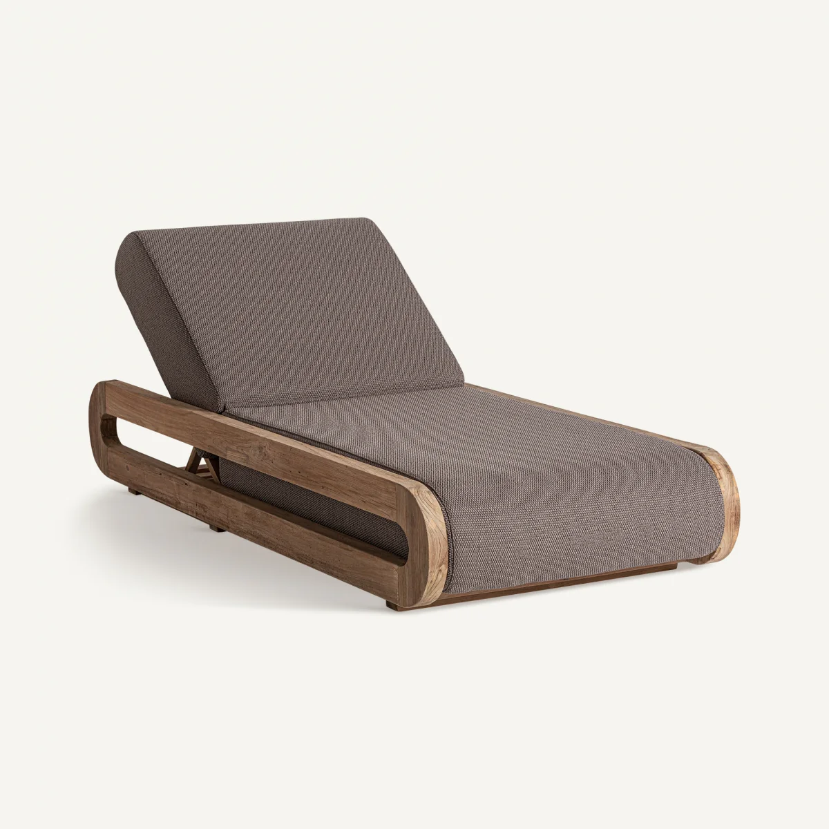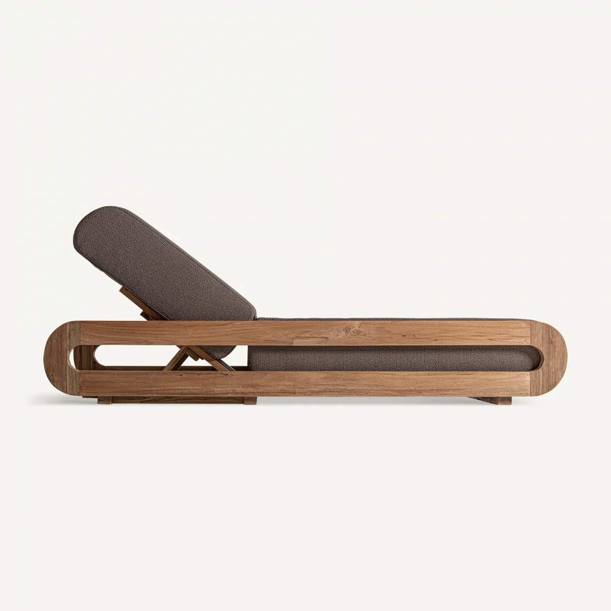Fabricada de madera de teca reciclada, esta tumbona con acabados cuidados al máximo detalle y de tapicería hidrófuga, es perfecta para disfrutarla durante todo el año.